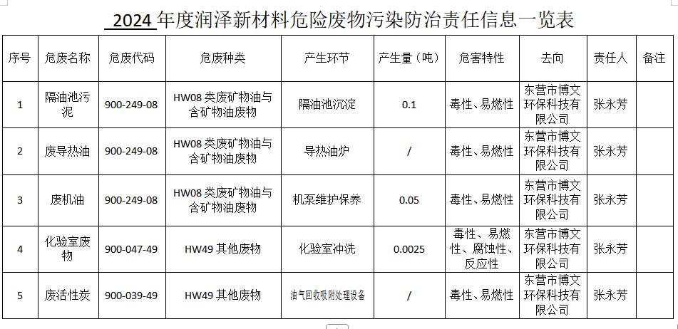 2024 年度潤(rùn)澤新材料危險(xiǎn)廢物污染防治責(zé)任信息一覽表